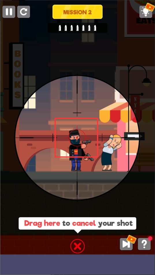 1、锁定目标时需保持稳定,手指按住屏幕移动准星对准歹徒头部,注意观察红色标记提示最佳射击时机。