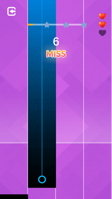 3、遇到蓝色琴键则需要持续按压不松开,直到其完全消失为止,长按时间会影响最终得分高低。