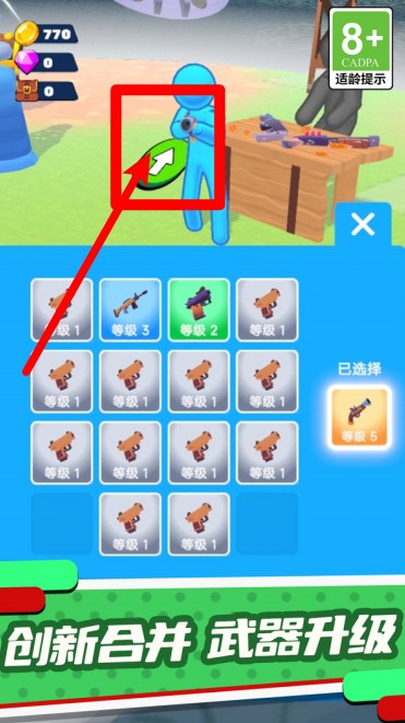 2.点击蓝色火柴人手持武器处,打开合成界面后,将相同等级武器合并成更高阶武器,提升整体作战能力。