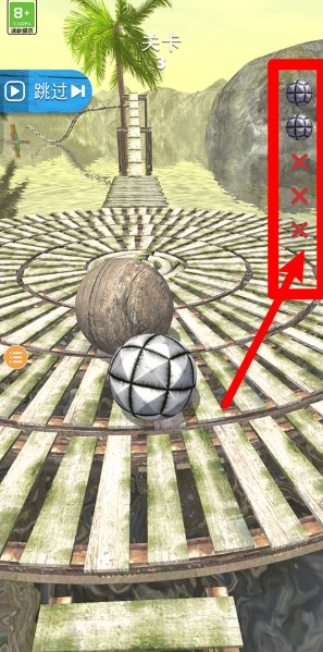 2.注意右侧图标显示的小球生命次数,保持专注避开障碍物,避免失误导致生命耗尽无法通关。