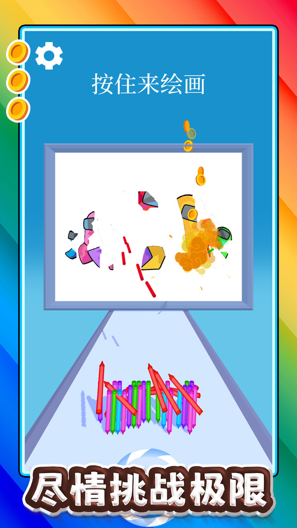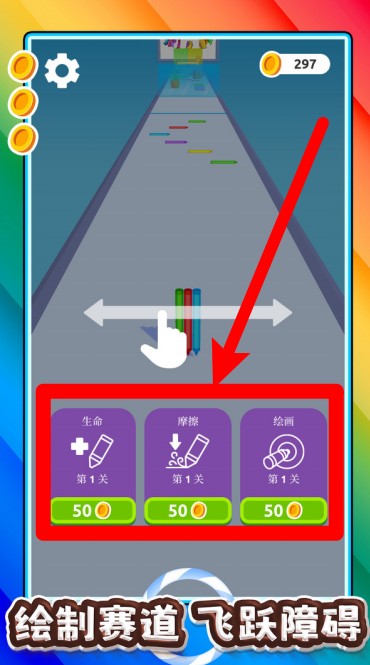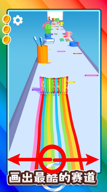 3.手指左右滑动控制画笔移动,在赛道上收集散落的彩色铅笔,扩展路径,打造独一无二的彩虹赛道。