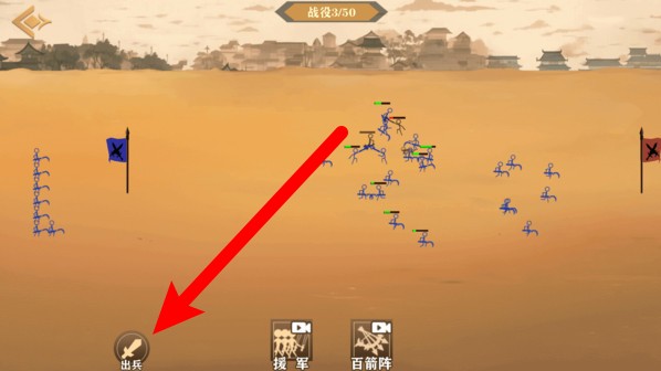 2.进入战场后点击“出兵”按钮,快速部署士兵展开阵型迎敌。