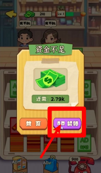 2.遇到资金不足时,可点击观看广告按钮快速解锁更多金币,轻松化解困境并持续进行经营活动。