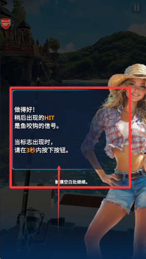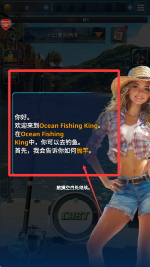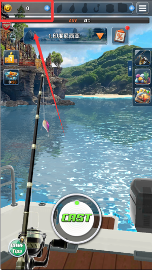 1、基础操作,点击CAST按钮抛出鱼钩,当浮标震动时立即点击屏幕开始拉扯,通过左右滑动屏幕控制收线方向。