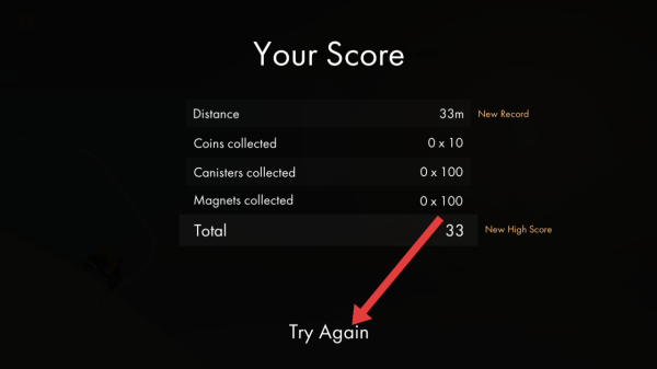 2、当操控火柴人骑行碰到其他的障碍物时,你需要点击【Try Again】的按钮重新游玩。