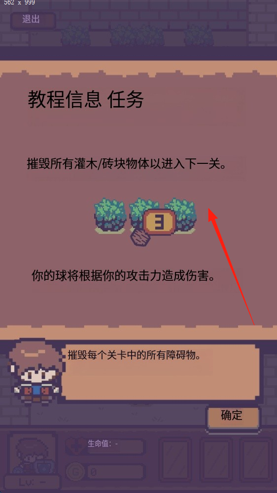 2、点击确定,继续得知摧毁所有灌木和砖块物体以进入下一关,球会根据攻击力造成伤害。