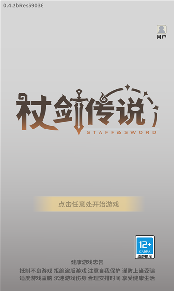 3、游戏启动页,呈现标题、“点击任意处开始游戏”及适龄(12+)、健康忠告。
