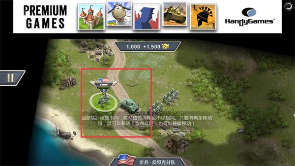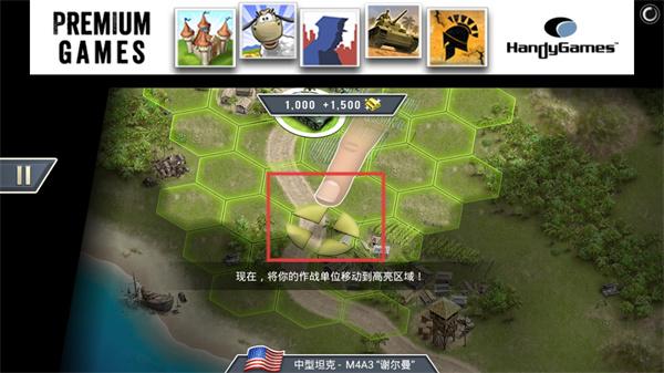 2、开始游玩后我们需要先选中一辆坦克,将我们的作战单位移动到前面区域。