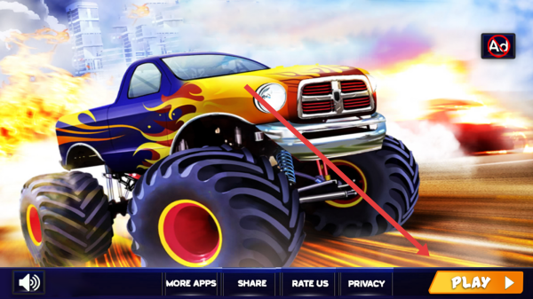 1、启动页,点击【PLAY】,进入怪兽卡车游戏,准备体验大脚车竞速,挑战高难度赛道。