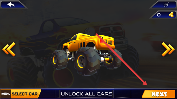 2、车辆选择页,确认黄色卡车后,点击【NEXT】,进入关卡地图,为大脚车比赛匹配赛道。