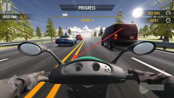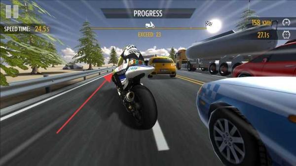 1、驾驶摩托车在公路行驶,留意【PROGRESS】进度条,利用速度(158KMH)超越黄色汽车等车辆。