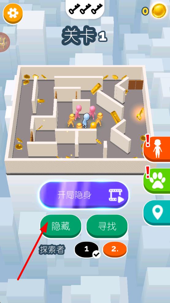 1、进入游戏后,选择模式(单人/联机),匹配后确定身份(躲藏者/寻找者),进入对应地图。