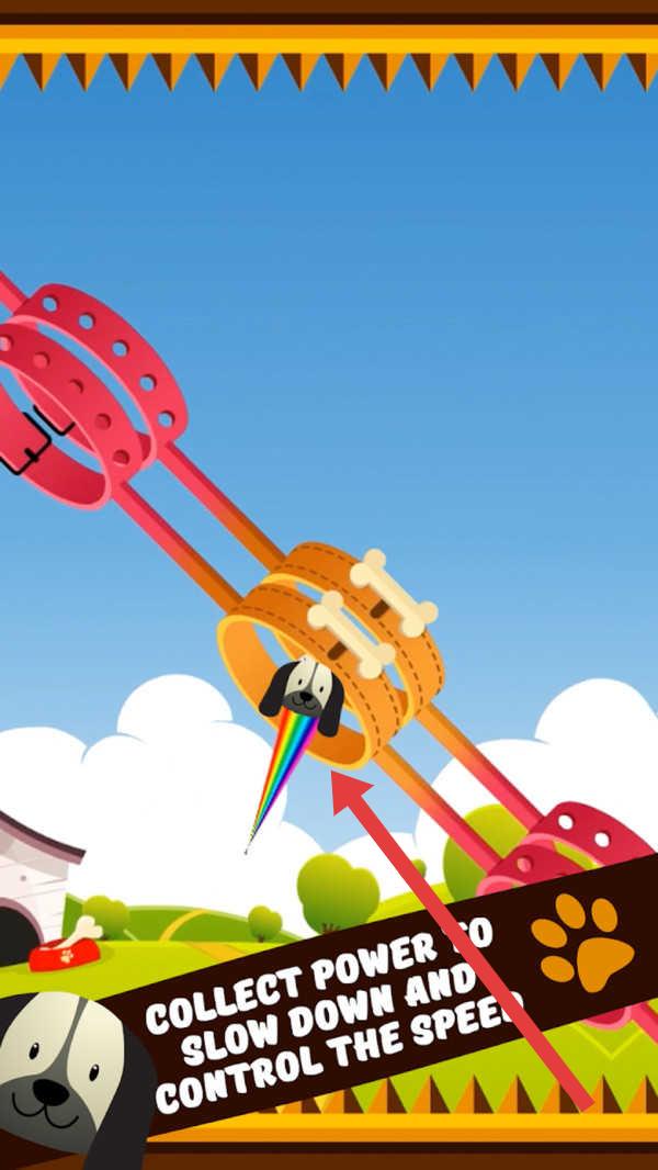 2、障碍关卡,操控狗狗,按箭头指引,穿过粉色圆环(PASS-THROUGH-THE-RINGS),完成阶段挑战,推进赛道。