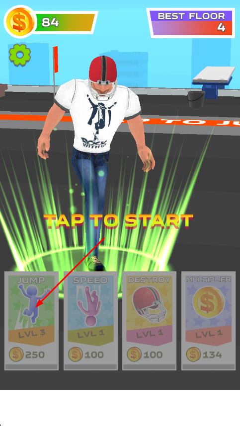 1、进入关卡后观察跳板角度,滑动屏幕蓄力调整跳跃力度,待指针到达最佳区域时松手,让角色垂直坠落击穿地板。