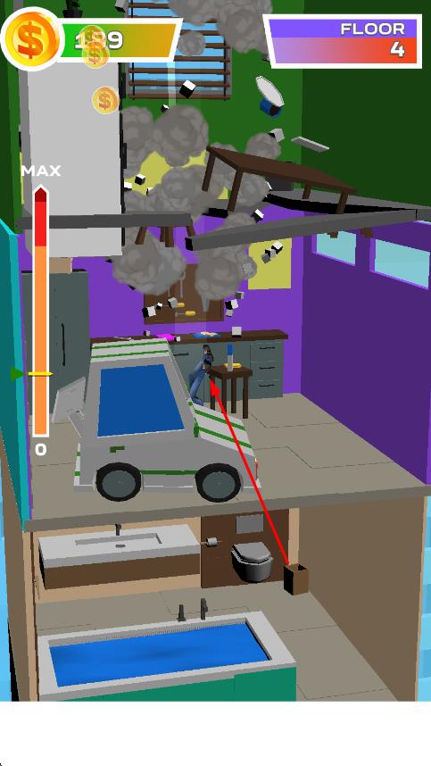 1、物理破坏机制:真实模拟落体冲击力,楼层家具随撞击实时破碎,砖块飞溅与音效反馈带来沉浸式解压体验。