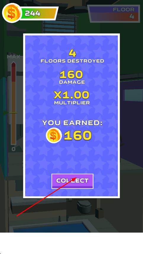 2、下落过程中避开钢筋、巨石等障碍物,操控角色左右移动收集金币与道具,利用冲击力破坏楼层内的家具获取额外分数。