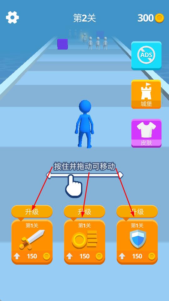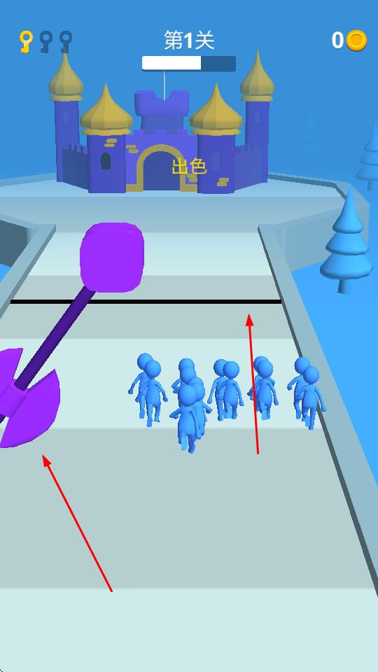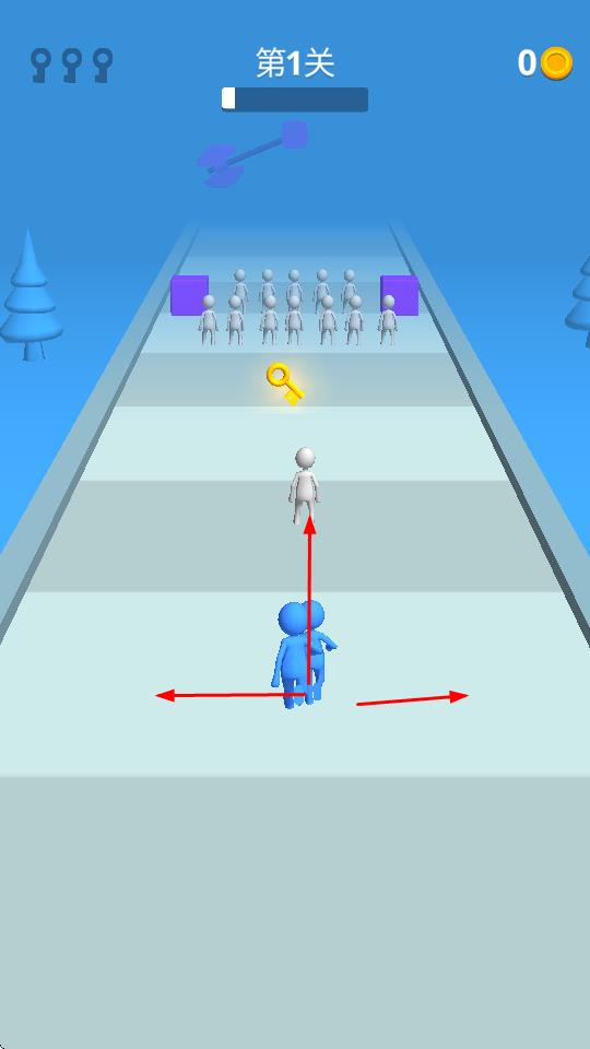 1、在关卡跑道,操控蓝色小人左右移动,选择汇合白色人群的路径,收集钥匙,壮大队伍。