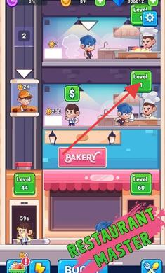 1、进入游戏,管理多层餐厅(如BAKERY、RESTAURANT),升级楼层员工、设施。
