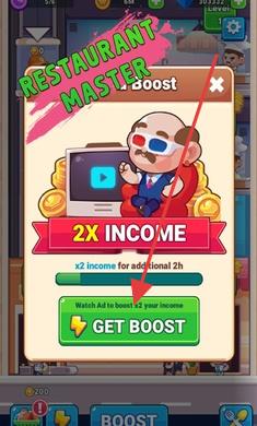 2、点击“GETBOOST”,观看广告获取收益加成(如2XINCOME),提升赚钱效率。
