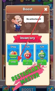 3、打开“Boost”界面,用道具(Shop、4x、10x)激活增益,扩大餐厅经营规模。
