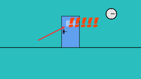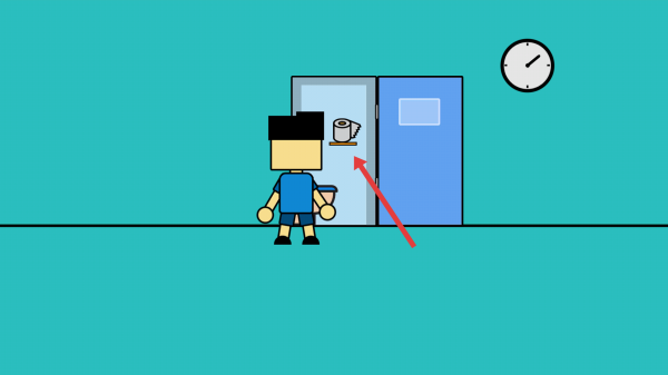 2、操控角色移动到门边,试图拿取墙上厕纸,触发门被锁,出现警示感叹号。