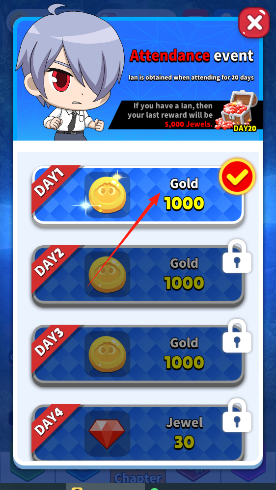 1、每日登录,领取对应天数奖励,累计20天可获特殊角色,解锁丰厚道具。