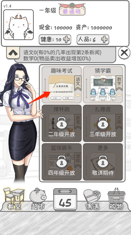 3、学业与经商双线并行,课程学习提供商业加成,考试成绩直接影响经营效果,留级机制增加游戏挑战性。