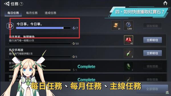 1、红宝石是这款游戏最重要的货币,不只是可以拿来抽角色、装备、宠物,也常常拿来解精通和购买其他商品。