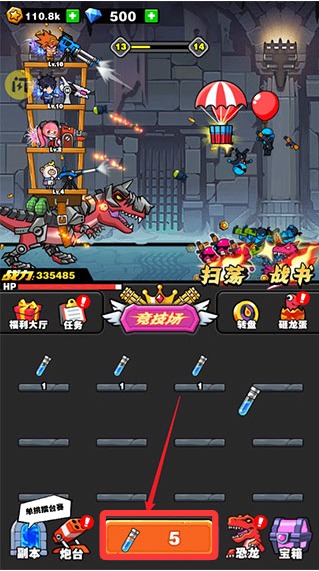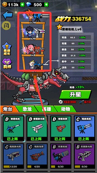 2、点击炮塔,可对炮塔、恐龙、英雄、动物等进行升级。
