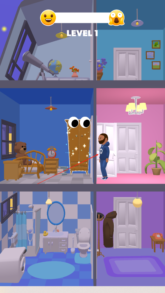 2、找准时机点击附身物品触发互动效果,如让台灯闪烁、相框摇晃,逐步积累人类的惊恐值,注意避开人类视线防止被发现。