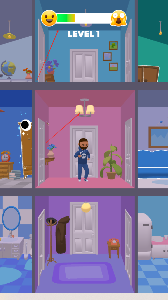 3、当人类惊恐值进度条拉满时挑战成功,可解锁新房间与幽灵皮肤,进入下一关卡继续探索不同场景的吓唬策略。