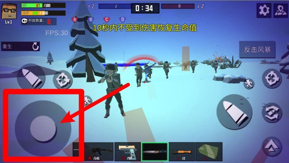 3.左下角为虚拟移动摇杆,滑动可控制角色走位方向,灵活走位可有效规避敌人子弹伤害。