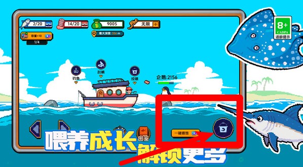 1.点击右下角一键收鱼按钮可快速结算收获,适合挂机刷资源玩家,加速成长完全不费手动。