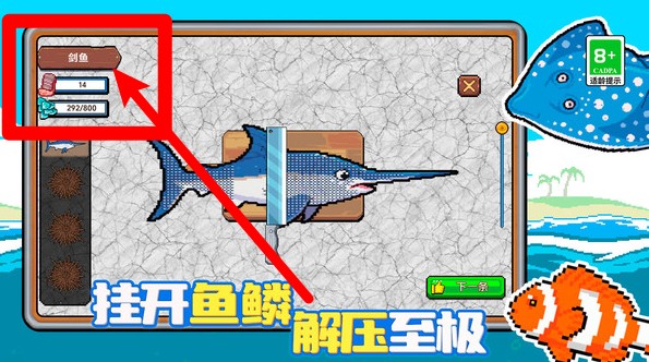 2.左侧可查看当前鱼类的种类与数量进度条,收集满一栏将自动解锁下一种鱼类开启全新挑战。