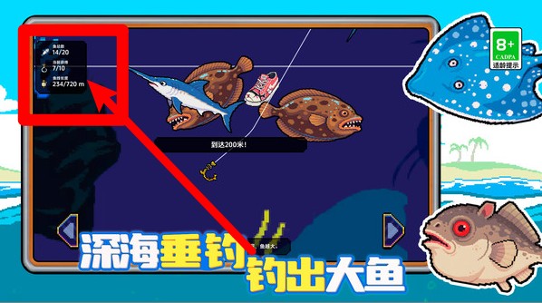3.屏幕左上方会显示当前下潜进度、线长与可容纳鱼量,帮助玩家判断是否继续下潜或开始回收鱼钩。