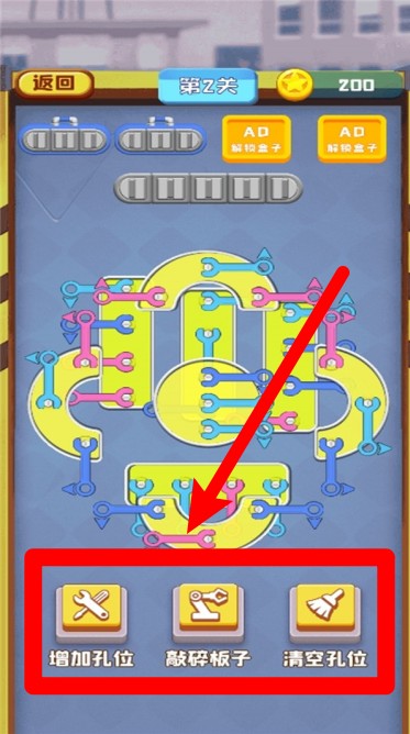 2.线路解谜关卡下方提供“增加孔位”“敲碎板子”和“清空孔位”三个特殊功能,能有效改变游戏结构节奏。