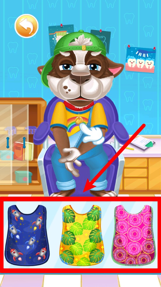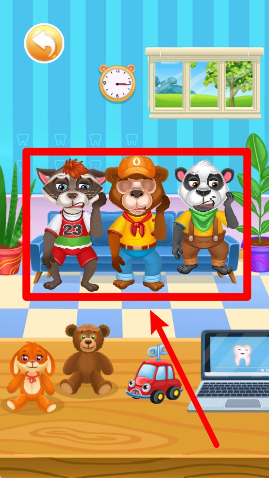1.等待座椅上的动物患者出现表情反应,点击其中一只即可进入治疗阶段,展开专属牙齿护理服务。