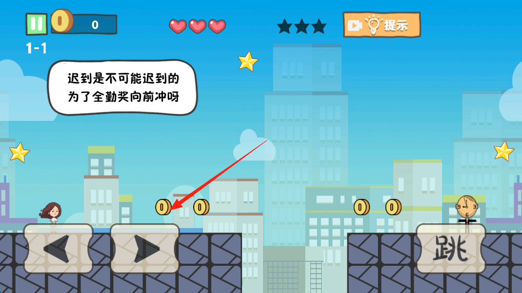2、用左右箭头控制移动,遇到gaps点击跳,收集金币,为全勤奖冲刺。