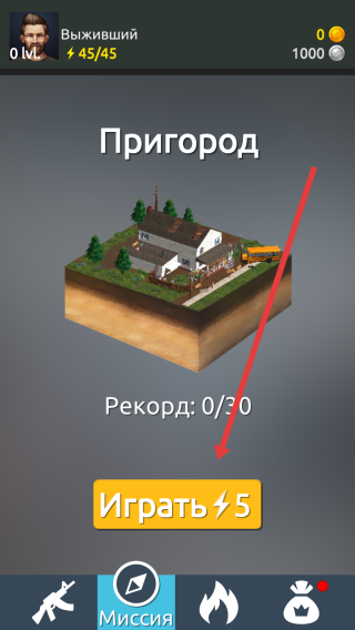 1、在场景选择页,点击【Играть】按钮,消耗5点,进入“Пригород”(郊区)场景,开启生存射击挑战。