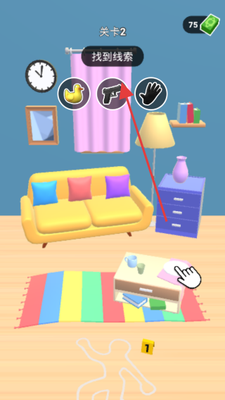 2、关卡2“找到线索”,在房间场景,点击箭头指向的“手枪”图标,收集线索,同时可探索沙发、抽屉等,找全目标物品。