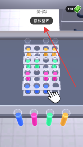 3、关卡3“摆放整齐”,将下方彩色试管,拖入对应颜色的试管架空位(如蓝色对蓝色),摆满即通关,锻炼空间整理能力。