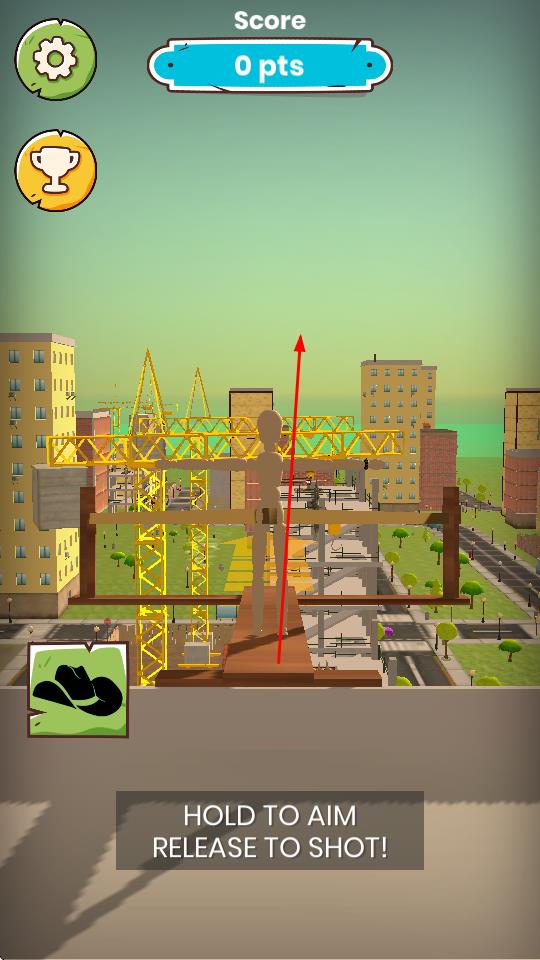 1、长按屏幕蓄力,调整弹射角度与力度,将木偶人从建筑平台弹出,利用物理抛物线,让其在空中飞行、碰撞场景。