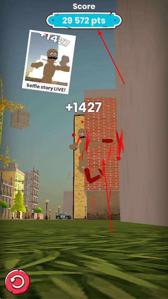 2、木偶人飞行中撞击建筑、地面等,触发碰撞得分,碰撞越复杂、路径越长,得分越高,挑战高分记录。