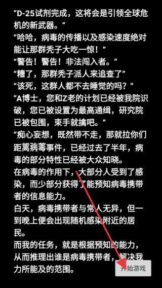1、阅读开场剧情,了解病毒危机、角色任务(推理病毒携带者),点击“开始游戏”,进入注册/登录流程。