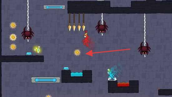 1、操控角色收集箭头指向的太阳道具,避开蜘蛛、尖刺陷阱,利用元素机关前进。