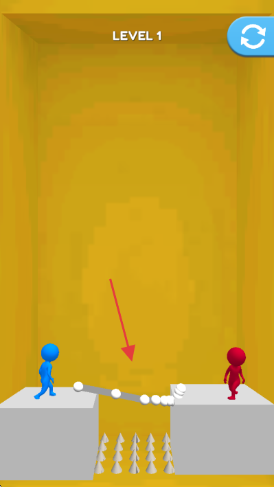 2、【LEVEL1】中,收集箭头指向的小球,铺成桥梁,助蓝红小人跨越尖刺。