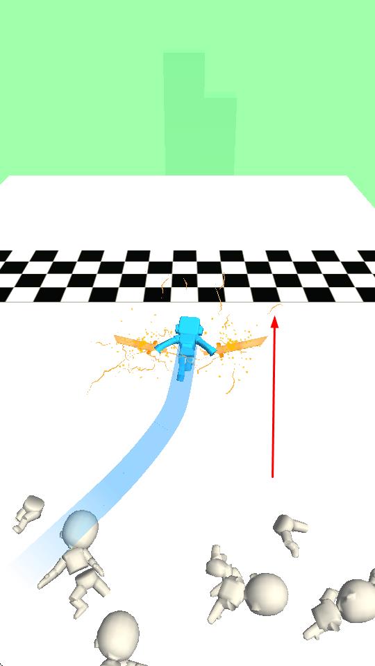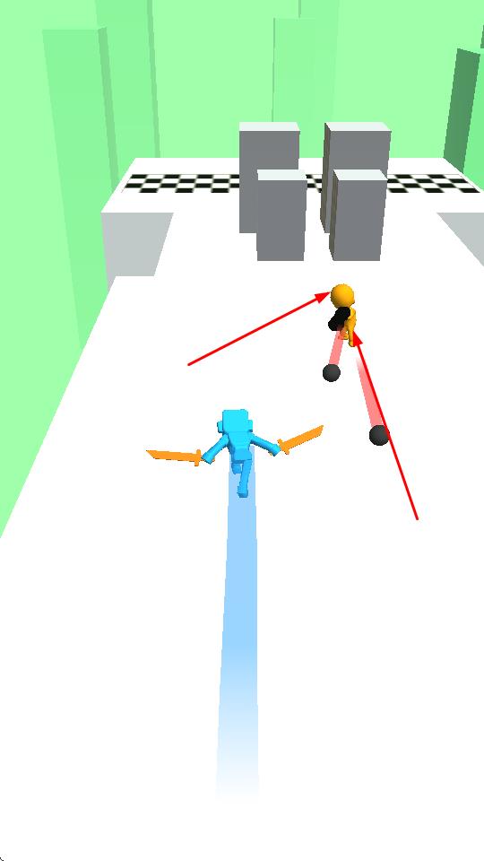 1、操控蓝色双刀角色,在跑道上遭遇敌方小人,通过左右移动、挥砍,击退敌人,开辟前进道路。