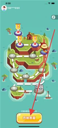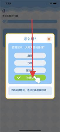 2、点“开始答题”选关卡,按题目(如西游人物、常识题)选/填答案,推进闯关。