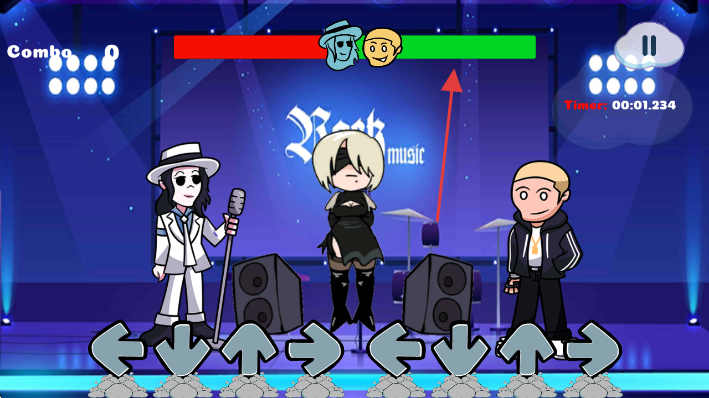 2、按下方箭头按键跟随节奏操作,推动上方绿色进度条,进行音乐对战。