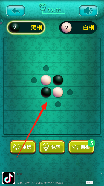 1、进入游戏,映入眼帘的是简洁棋盘,棋盘中央已预置黑白各两枚棋子,作为先手玩家,思索后在空格落下首枚棋子。